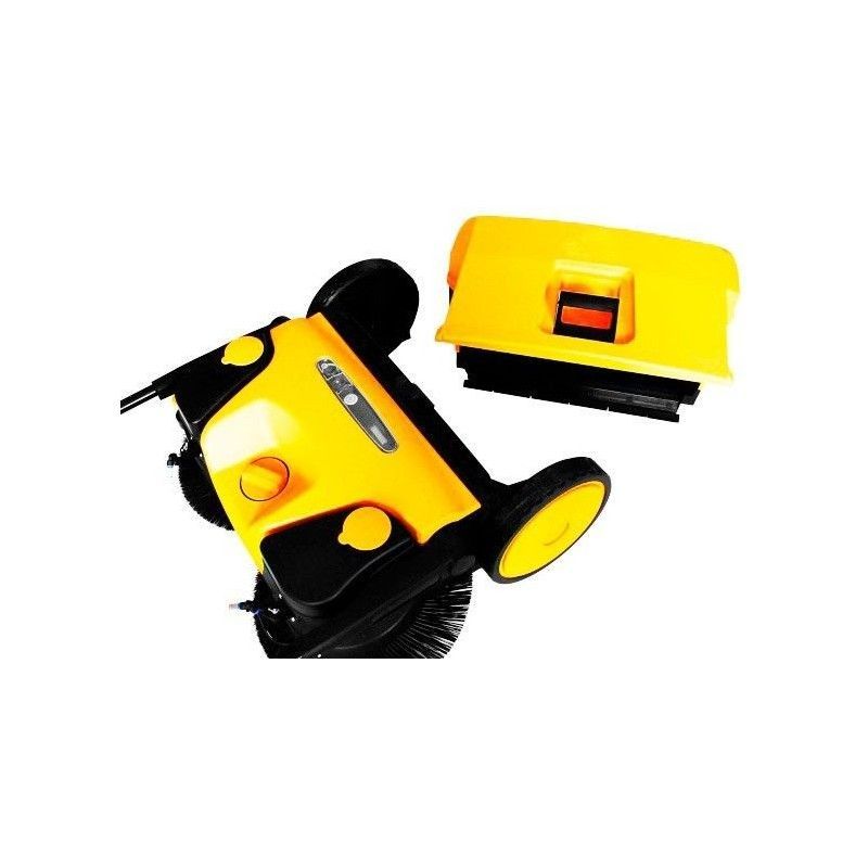 Sweeper manual traction with electric brushes and water spray. It has two side brushes and a central roller all electric Performance up 3.800metros square/h and 50 liters of capacity in the tank.