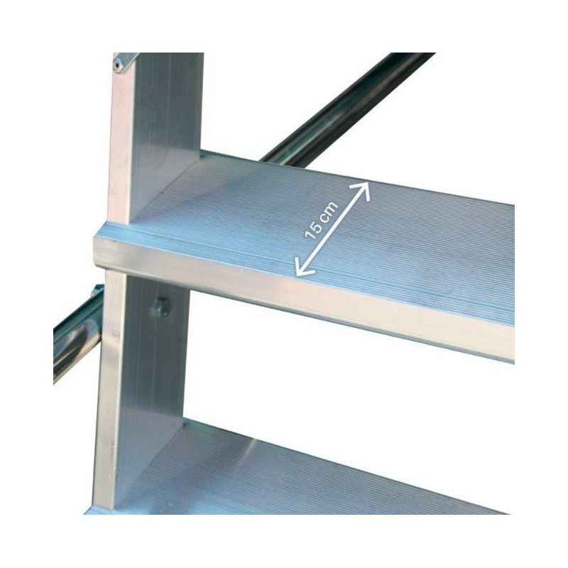 Scala pieghevole con ruote e ampio piano di antiscivolo 520x620mm, capacità di carico di 150 kg. Con accesso attraverso una scala con inclinazione a 60º e passi antiscivolo da 150 mm di profondità e corrimano su entrambi i lati.