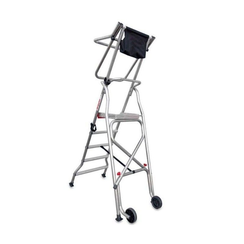 Scala pieghevole con ruote e ampio spazio di lavoro antiscivolo 400x400mm con accesso da una scala con gradini antiscivolo di 100 mm di profondità. Carico massimo di 150 kg.